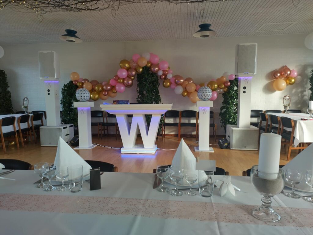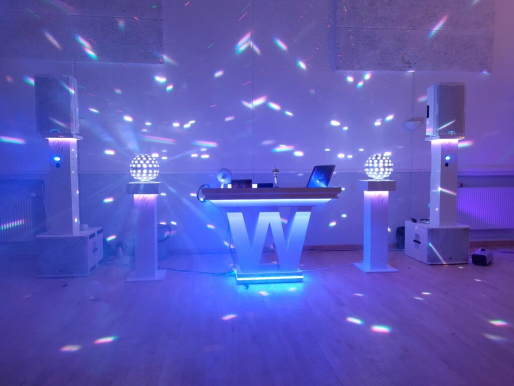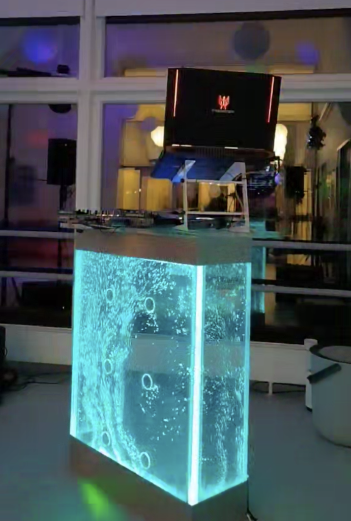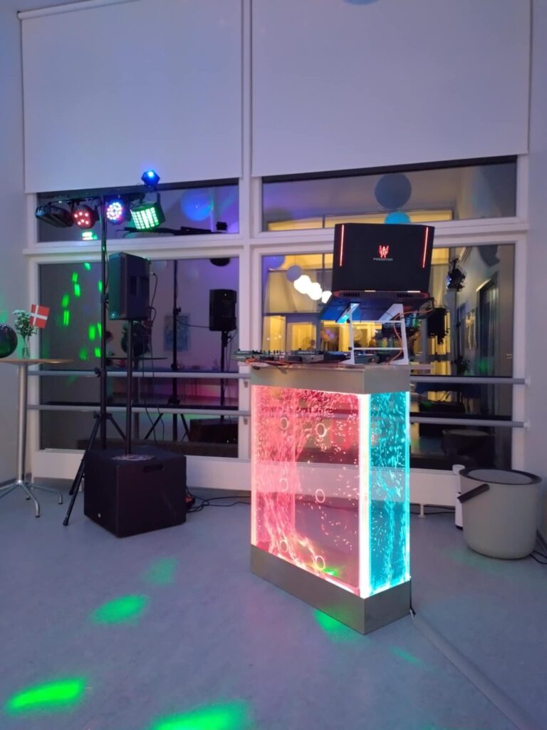 Unik skønhed, Vand, bobler og skiftende LED-Lys, 2xStore højtalere og 2x Lysstativ – En opstilling, der virkelig også folks opmærksomhed, og er ideelt til alle slags fester
